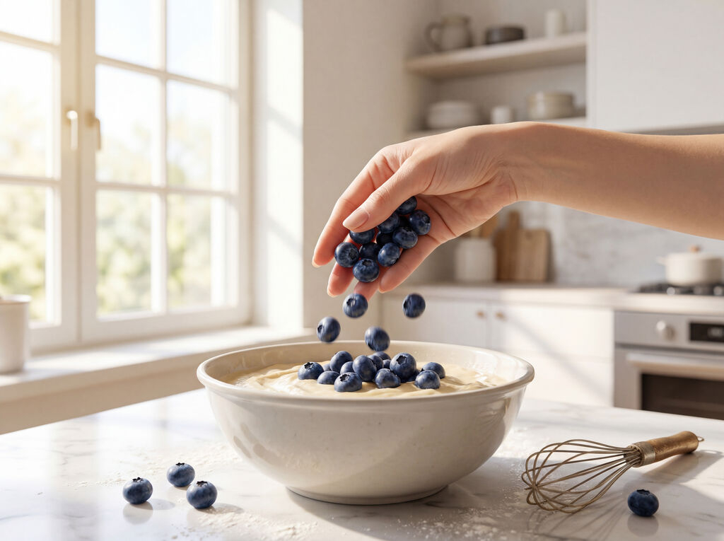 • Fold, don’t stir: Fresh blueberries are more delicate than you think. Two or three careful folds are all you need — anything more starts breaking the skins and creates that blue streak through your batter. This is baking, not CrossFit.